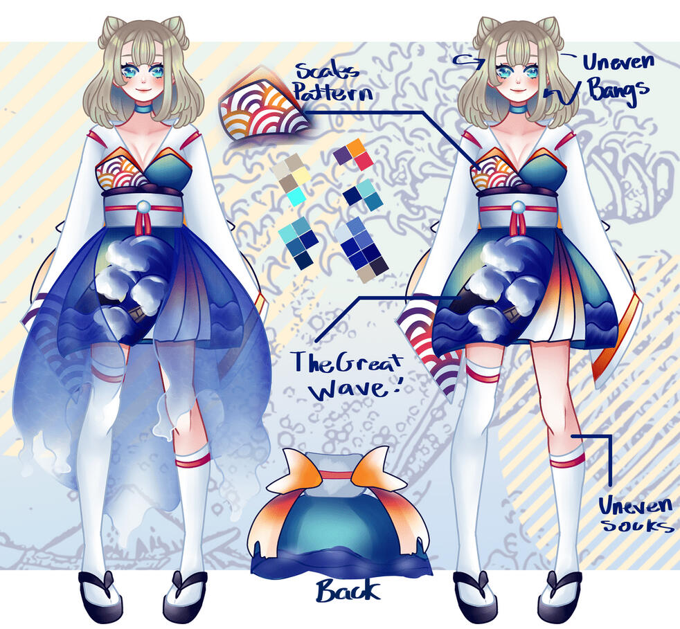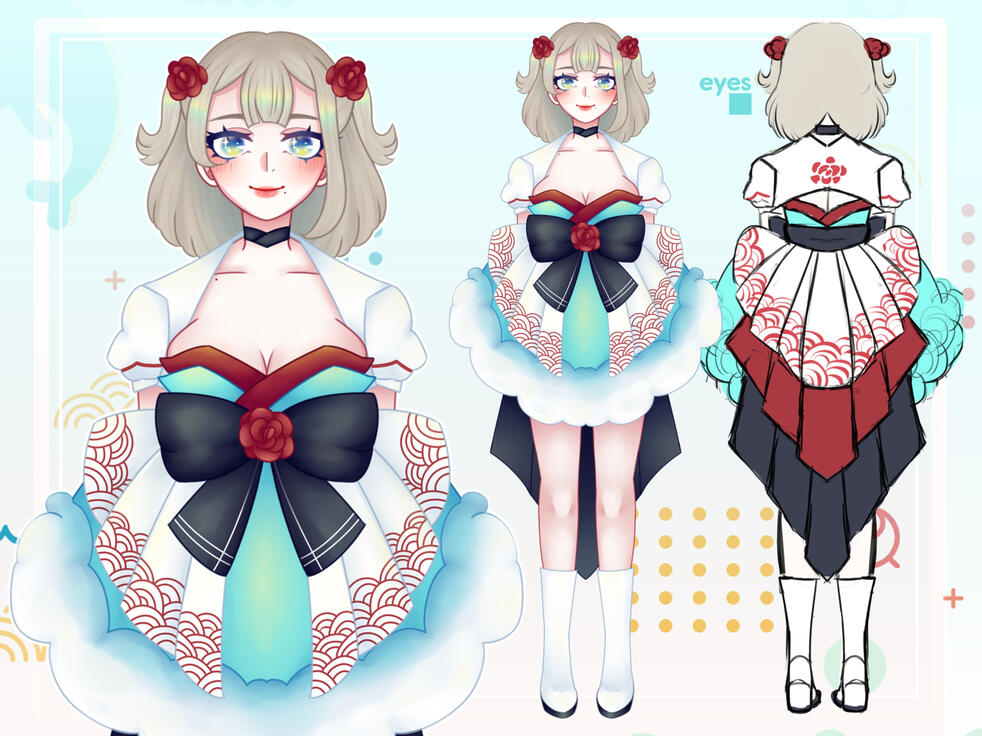 This reference sheet is of Koi Erena's original outfit. Clicking on the image will bring up an HD version.